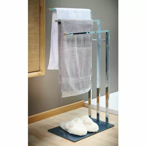 Apportez une touche déco dans votre salle de bains ! Les porte-serviettes VERRY associent l’acier chromé au verre pour un style épuré et contemporain. Fonctionnels, ils disposent de barres espacées pour un séchage rapide des serviettes, et restent stables grâce à leur large base en verre.