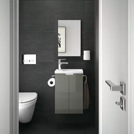 - Meuble sous-vasque avec 2 portes, charnières à fermeture progressive et prise de main directe biseautée : Largeur 40 cm Hauteur 57 cm Profondeur 25 cm