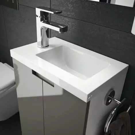 - Vasque profonde et réversible en polybéton (matériau de synthèse composé essentiellement de minéraux liés par des résines).